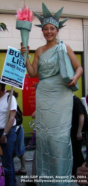 used colorful costumes to express their outrage over Bush's wars and presidency. One woman came as Lady Liberty -- on stilts! Another lady donned