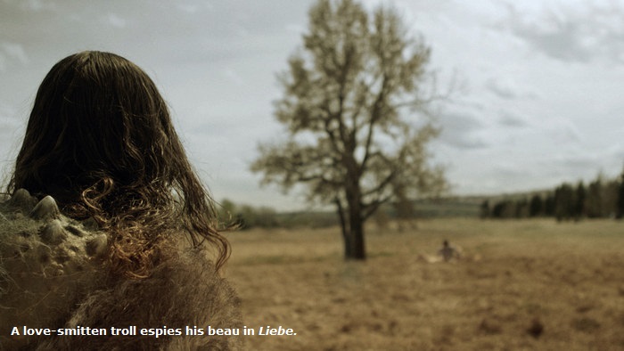 In a bucolic meadow, amid enchanting music, a young beau rhapsodizes on his love for the maiden in his arms. Although this is a Canadian film, his voiceover is in German, evoking a Brothers Grimm, fairy tale ambiance. Suddenly, a troll (or whatever) rushes the lovers, butchers the girl, and abducts the man. Then this hideous beast rhapsodizes on his love for the horrified man, speaking identical words, albeit in his troll language.