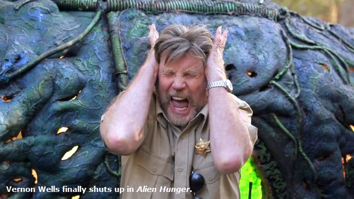 Alien Hunger's humor is mostly dialog-based. Characters are always tossing quips and barbs at each other, sometime playful, sometimes spiteful. This is both good and bad. Some lines are funny. But the two leads (Vernon Wells and Richard Hatch) overdo it. Seemingly incapable of talking to each other absent witty banter, their comedy act begins to annoy. Even as they approach the deadly alien pod, they're still joshing back and forth, Wells grinning at his own jokes.