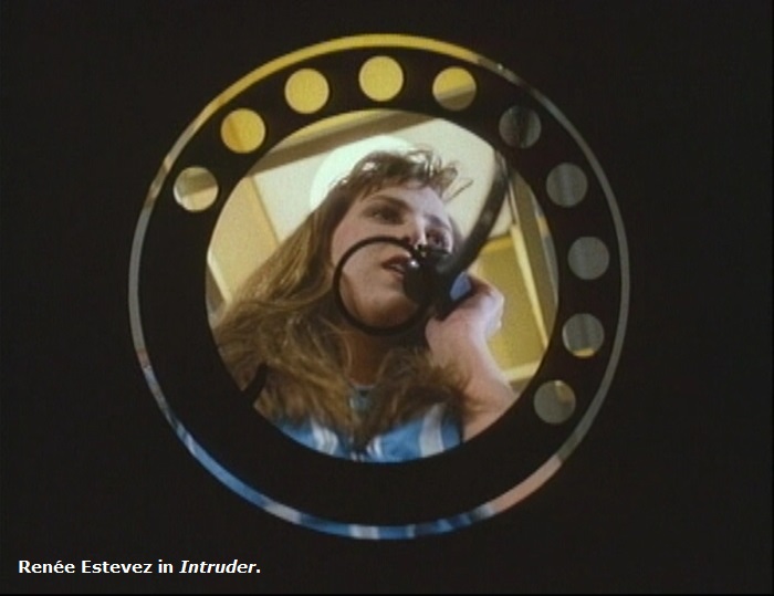 This gimmick evokes Intruder, a 1989 slasher film boasting similar visual playfulness. Consider the above shot of actress Renée Estevez, seen from the telephone's point of view. (Does anyone still remember rotary dials?)
