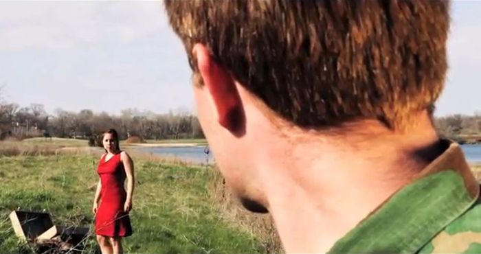 And the future is hopeful. Colors brighten when two soldiers share a romantic moment (he having found a red dress for her -- second image above), and when Kevin continues his trek toward the film's end.