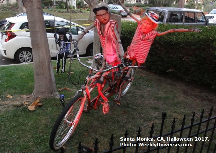 Farther up the street, another Halloween display featured Donald Trump riding a tandem bicycle driven by North Korean dictator Kim Jong-un.