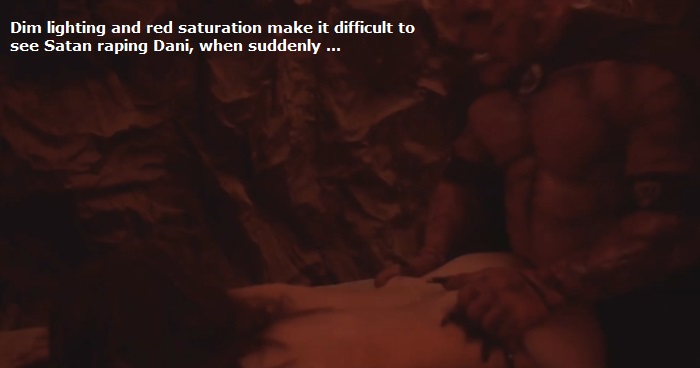The final half hour follows Dani in Hell. (Like Dante in Inferno?) Art director Adam Rettino provides us with a classical depiction of Hell. A series of caverns saturated in red light (sometimes making it difficult to discern events on screen), with fiery torches, medieval torturers clad in leather and mail, and feral demons feasting on human flesh. Dani is chained and tortured, then taken from cavern to cavern, where she witnesses new horrors, and is finally raped by Satan himself.